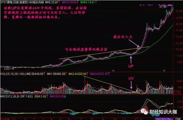 (2)回档越浅的【UP】才越显强势,以不跌破60日平均线为好,跌破过深的需要多观察一段时间,最好等股价重新爬上60日平均线再寻找机会买进。