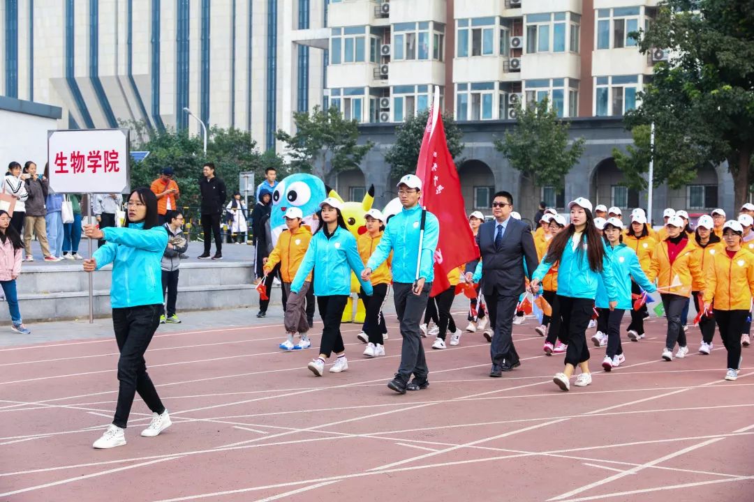 党委书记孙德昊和我院50余名运动员代表组成的入场式方阵,他们穿着生院经典橙配蓝组合齐步走向主席台,与之颜色相配的吉祥物E.coli和皮卡丘相伴左右。他们迈着矫健的步伐,呼喊着嘹亮的口号,“以勤为盾,以智为矛。生生不息,明物之道”,非凡的气势显现出生院人的英姿和不息的生机。
