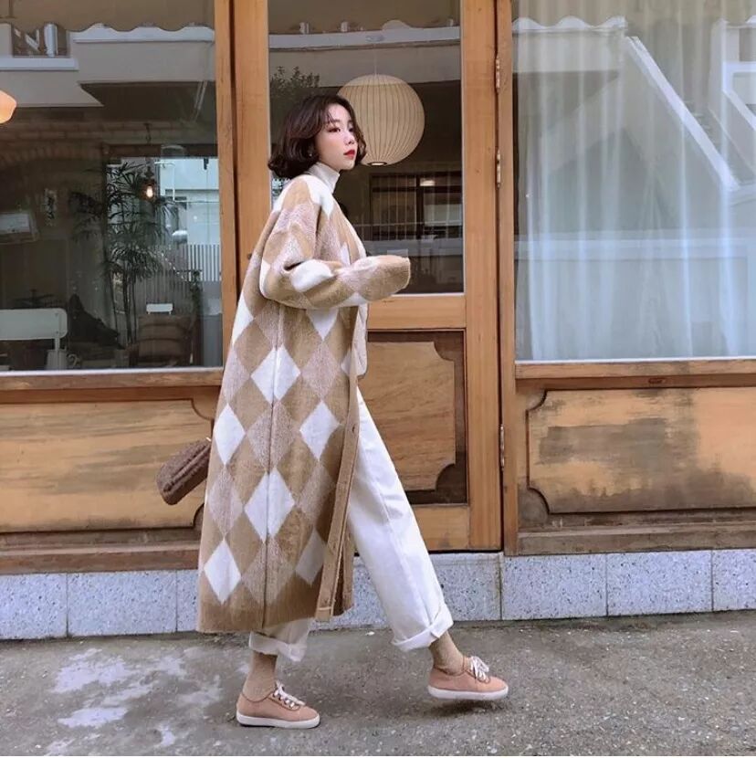 厚一点的奶奶衫多以宽松款居多,姜黄的色调显白显气色,对黄皮的小可爱们都很友好。大格纹阔腿裤舒适度满分,追求休闲风的千万别错过。