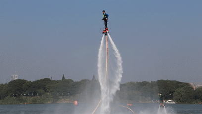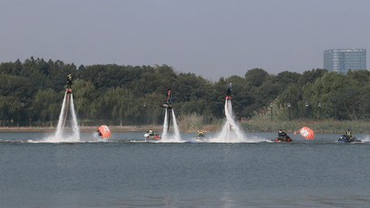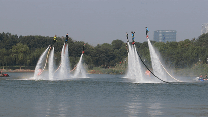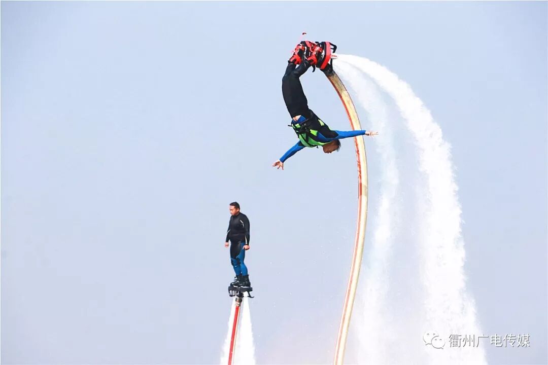 7名水上飞人脚踩喷水喷射悬浮飞行器,像海豚一般跃出水面,激起层层浪花,空翻、转体360°度……高压水柱在他们的脚下呈现出不同造型,岸边早已尖叫声一片。