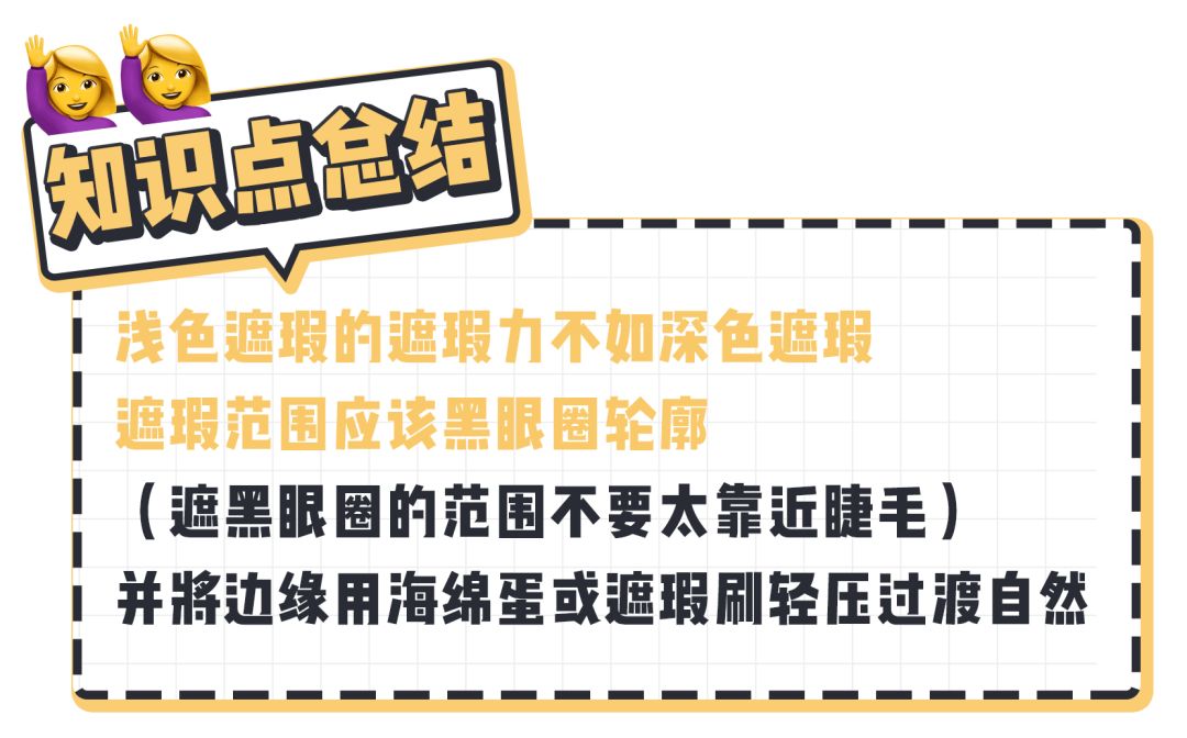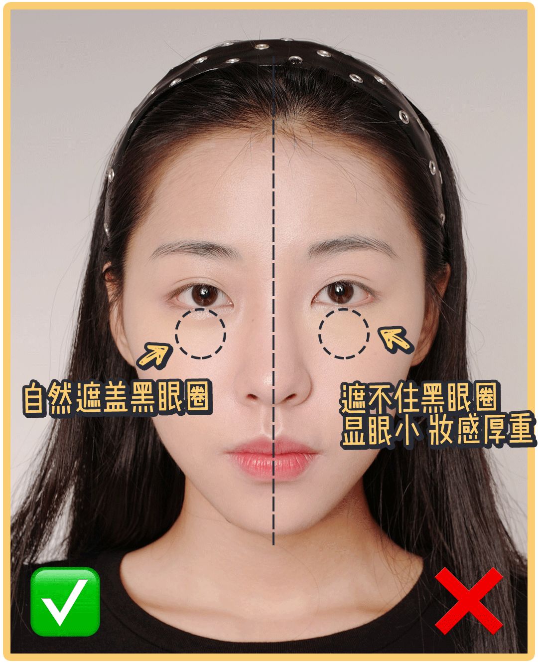 大家每天熬夜上网冲浪,就很需要遮黑眼圈,但是用浅色的遮瑕直接整个涂抹在眼下,是会大NG的哦。?