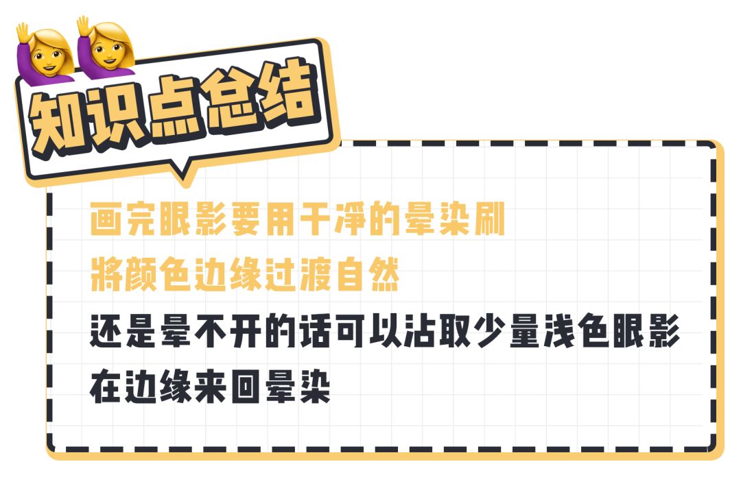 画眼影应该像对待哥哥一样温柔,少量多次,一般来说,眼影的打底色涂在眼窝处,加深色涂在眼尾处(但不要超出眼窝),上眼皮的提亮色范围在眼球上方就ok了。?