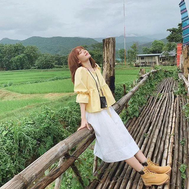 黄色candy袖blouse搭配白色长裙,清新自然,脚踩一双黄色马丁靴,舒服和好看并存。