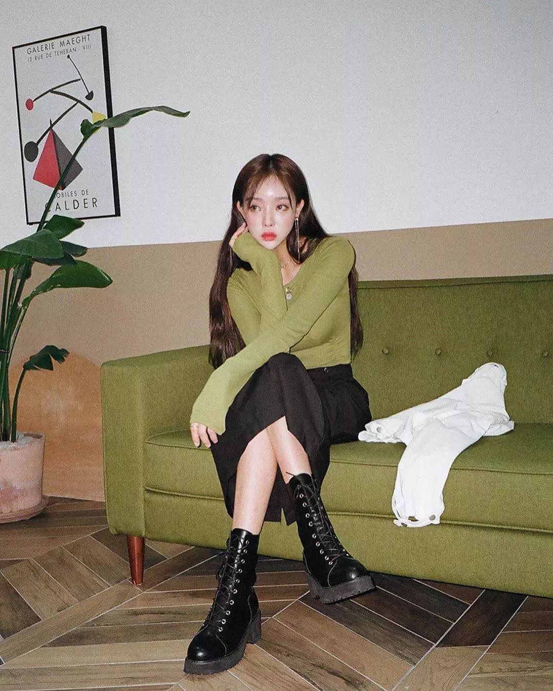抹茶绿紧身打底能够很好地展现你的玲珑曲线,搭配黑色长裙与马丁靴,女人味满分,美到不像话。