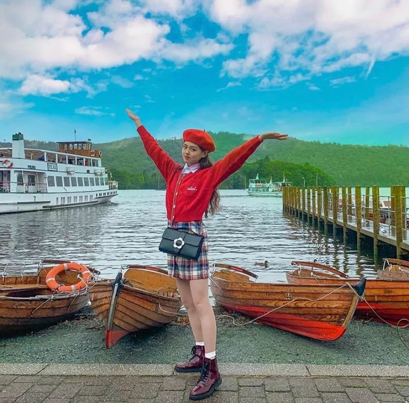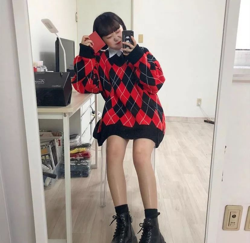 还在上学的小可爱可以尝试一下oversize的菱形格毛衣,露出衬衫领英伦风十足,再穿上一双堆堆袜和马丁靴。