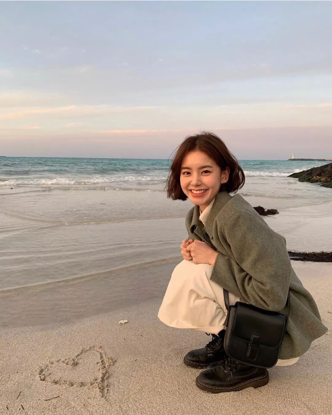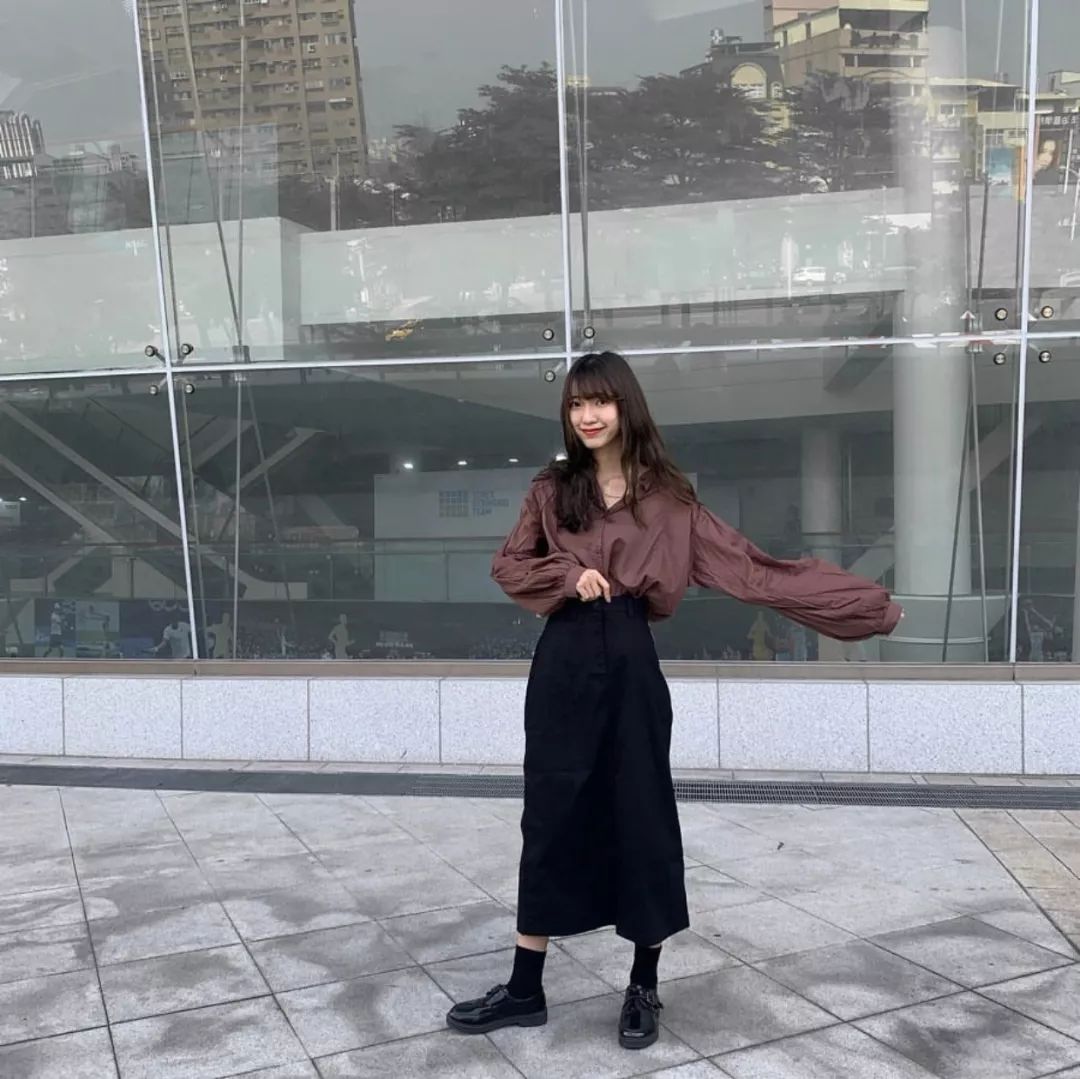 除了高帮以外,低帮款马丁靴与半身长裙也很配,上穿一件宽松版型的棕色衬衫,看起来既文静又乖巧。