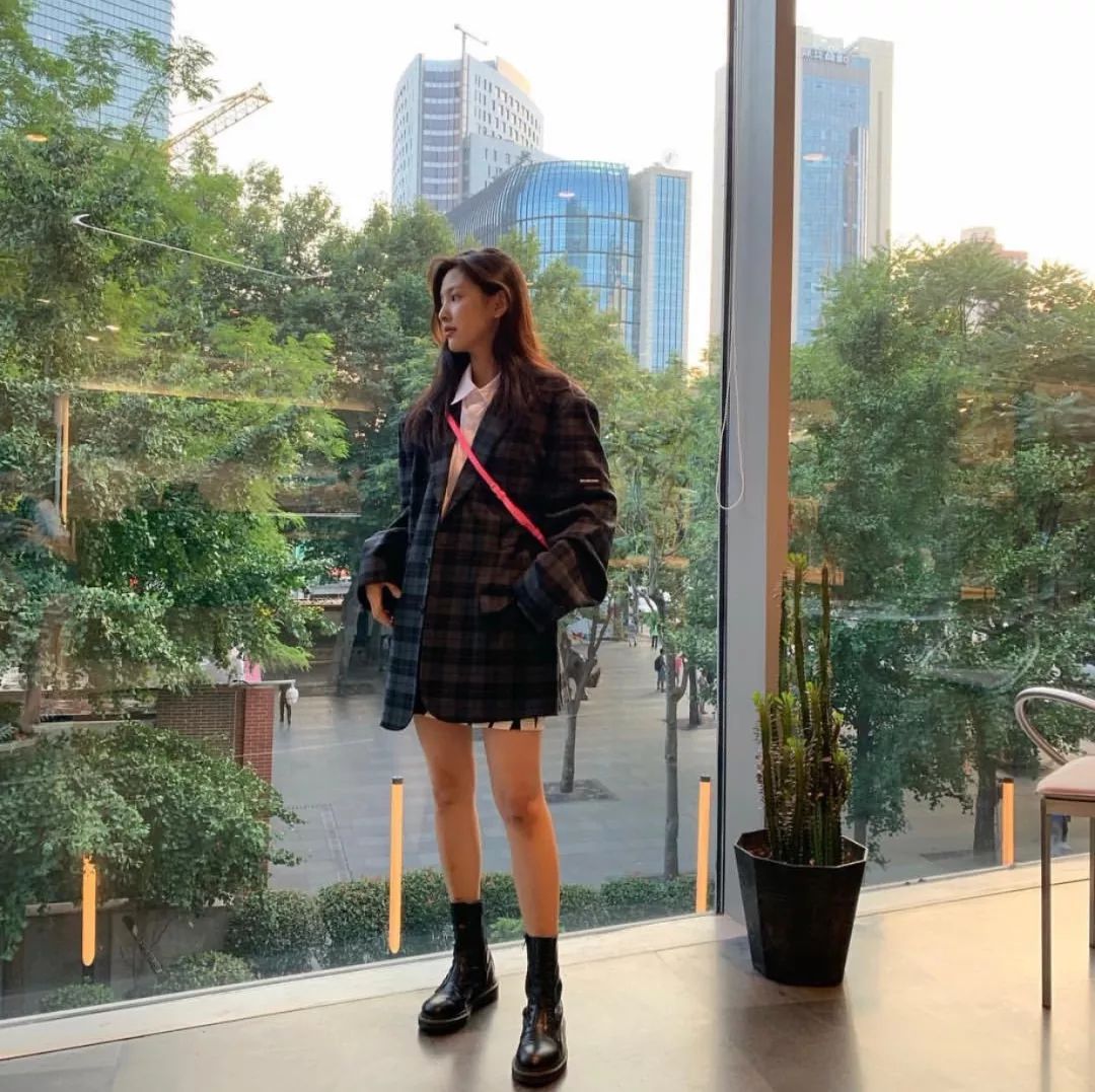 也可以像章若楠小姐姐一样选择一件oversize的格纹西装外套,内搭白色衬衫和短裙,平添了一份酷感。