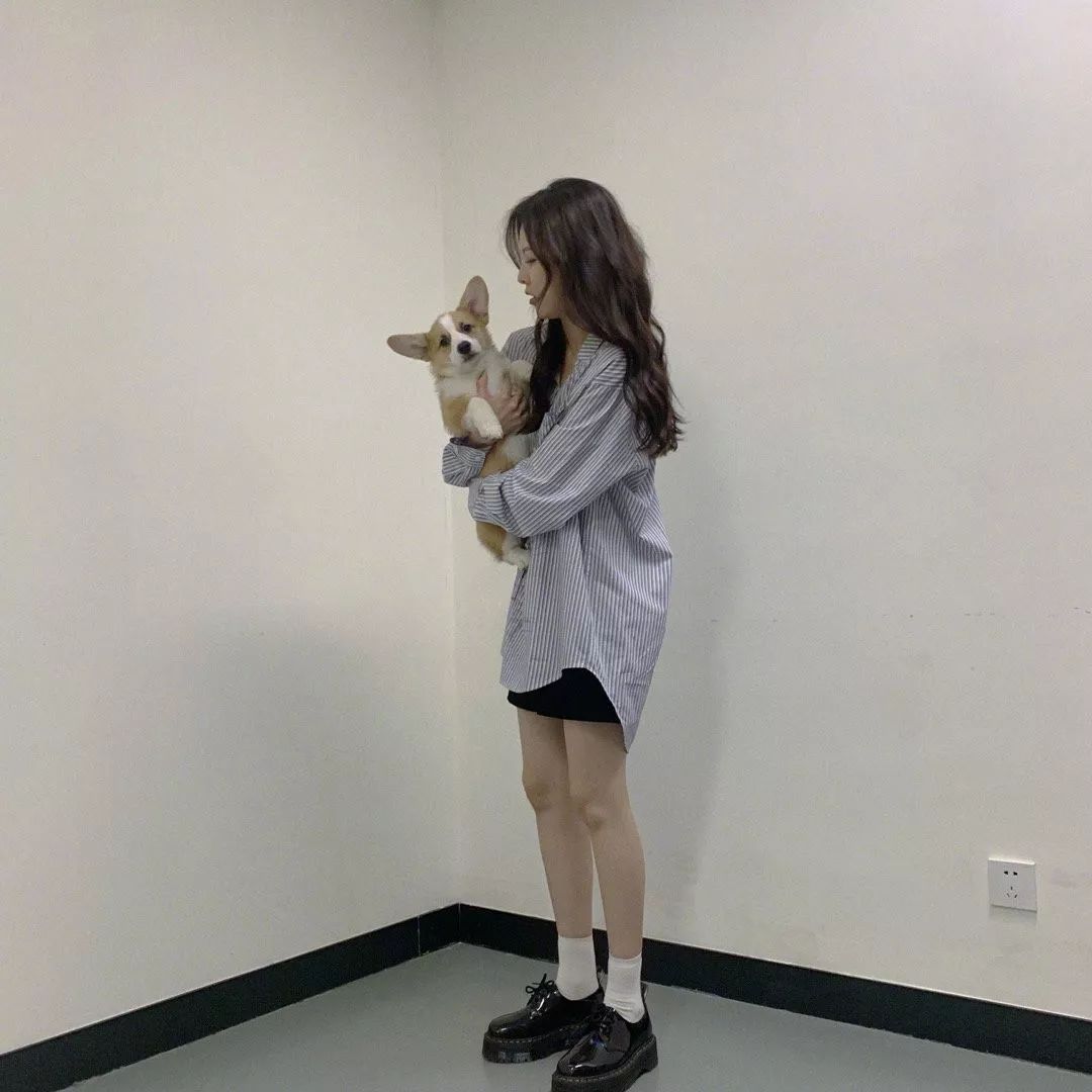 oversize的竖条纹衬衫搭配白色短袜+低帮光面马丁靴,看似简单的造型却格外显品味。