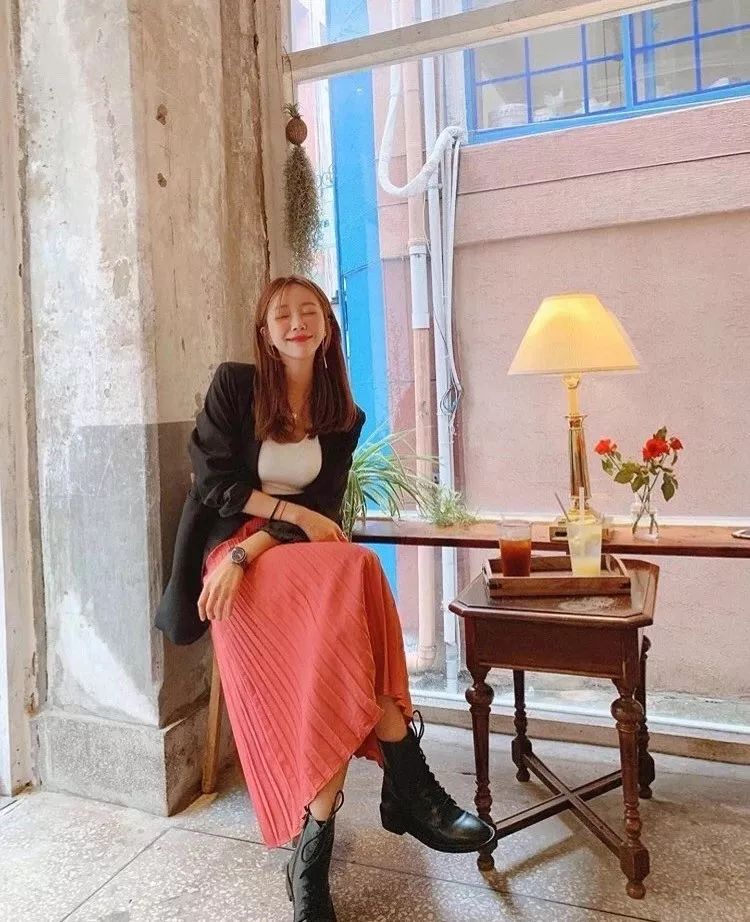 近期巨流行的娘man平衡风你get了吗?黑色西装外套与马丁靴中和了粉色百褶长裙带来的甜腻感,三者配合的恰到好处。