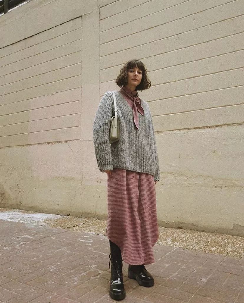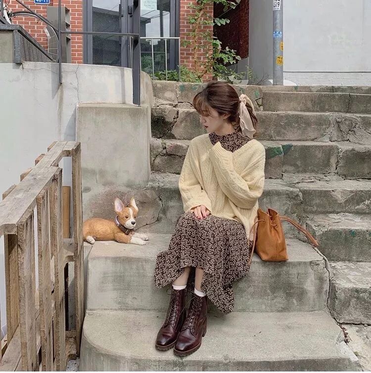 森系女孩醉爱的小碎花裙+米色麻花毛衣,与酒红色马丁靴配合的完美无缺,再用一根发带绑起头发,文艺气息扑面而来。