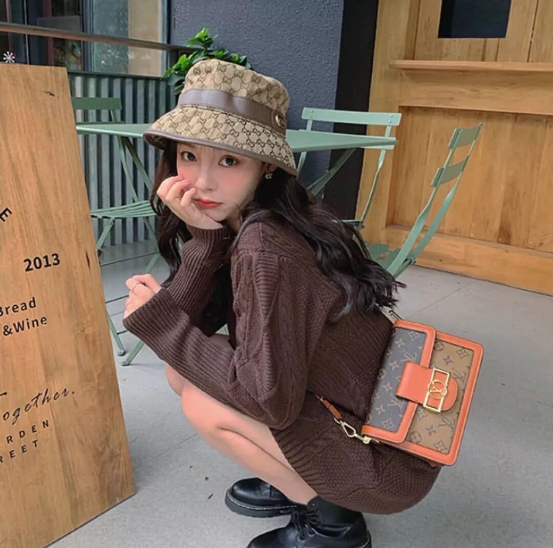 宽松的棕色麻花毛衣蕴含着秋日气息,渔夫帽与斜挎包的添加提升了整体的时尚感,让你一下子就从人群中脱颖而出。