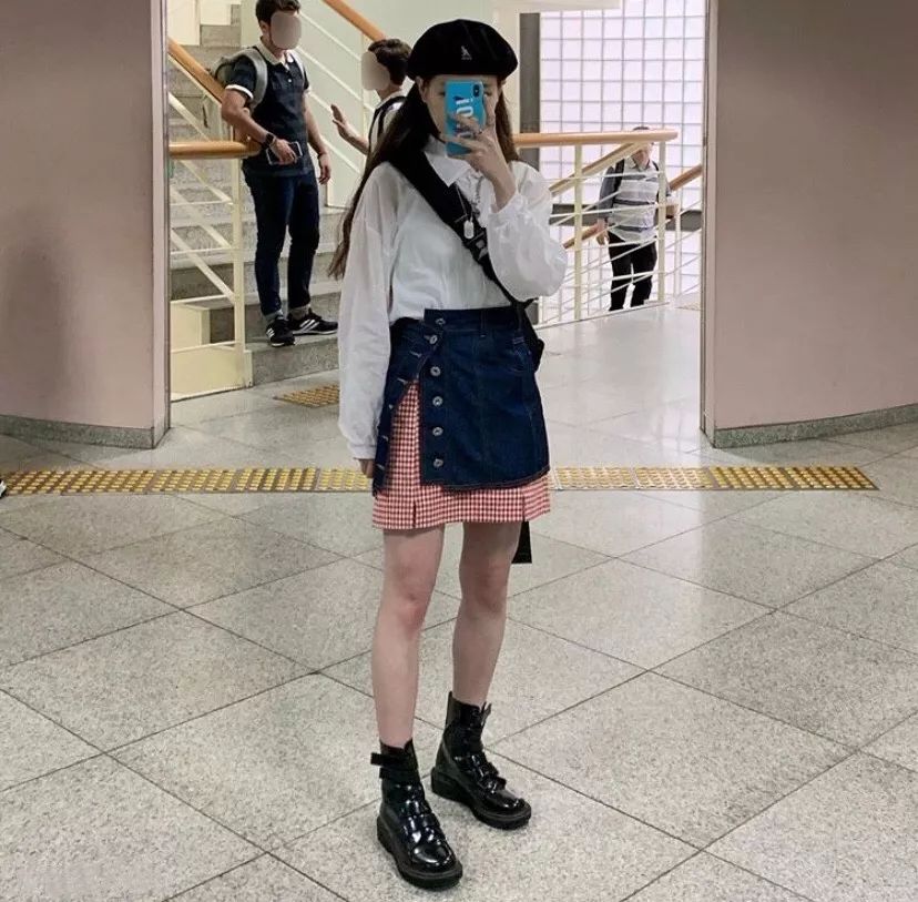 之前教过你们的裙子+裙子的方法也可以尝试起来,内外层次感丰富,搭配白色衬衫与马丁靴,学生党也可以穿。