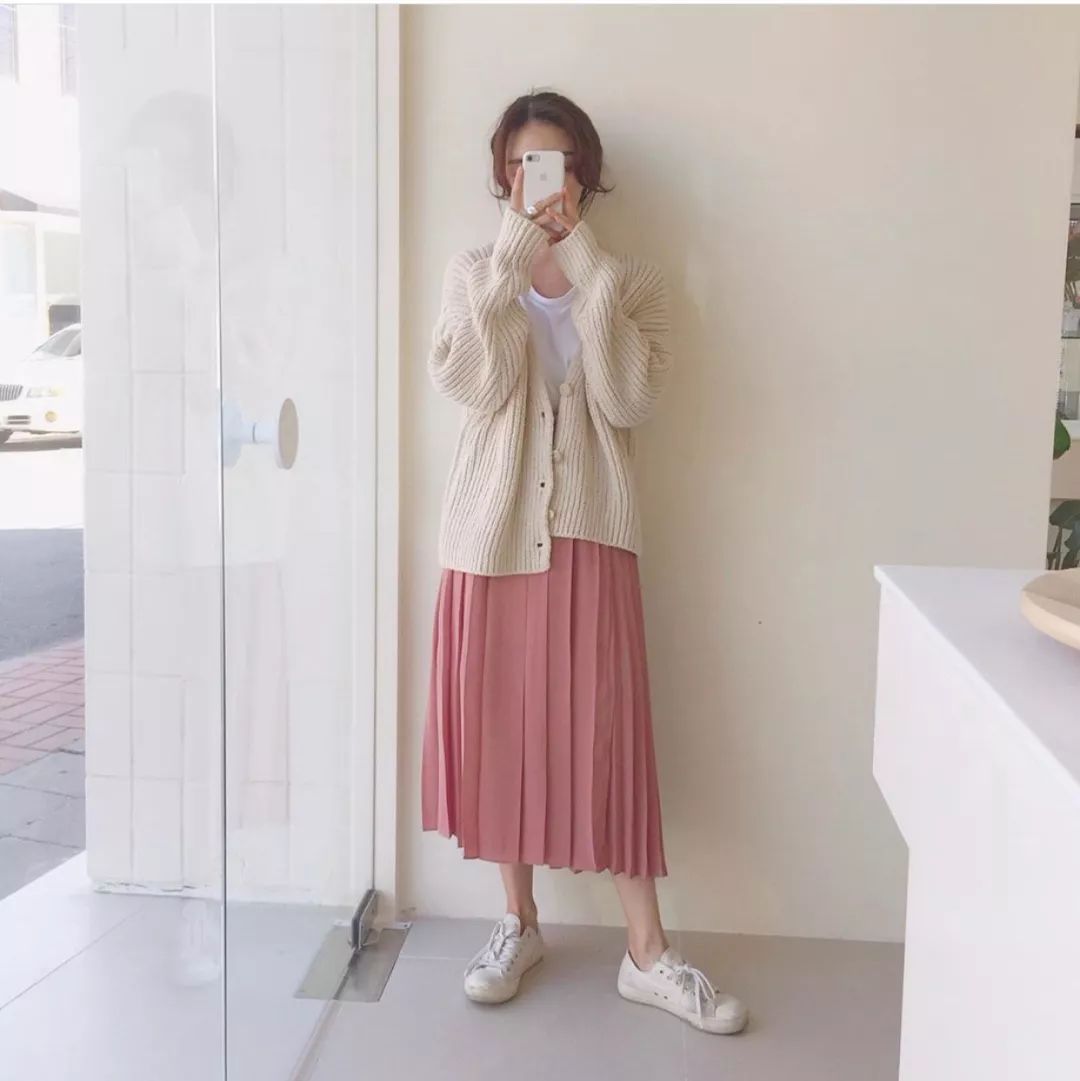 米色奶奶衫+粉色百褶裙+小白鞋,拗出了清新干净的穿衣风格。