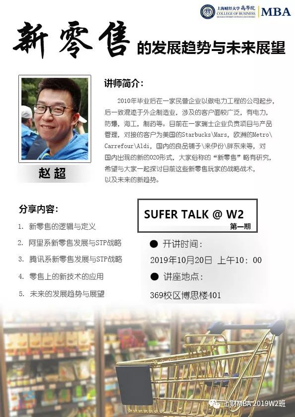 SUFER TALK @ W2第一期,《新零售的发展趋势与未来展望》,来自学习委员赵超同学,期待您的参与。Let’s seize the future !