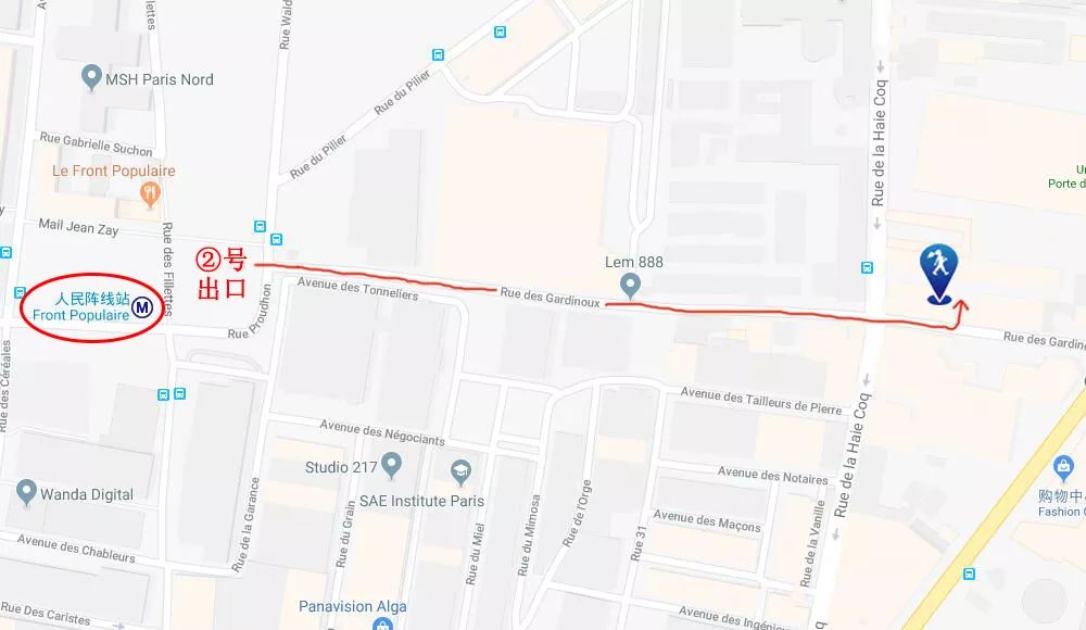 乘坐地铁12号线到终点站Front Populaire,2号出口出来直走5分钟后左拐进入院子里。