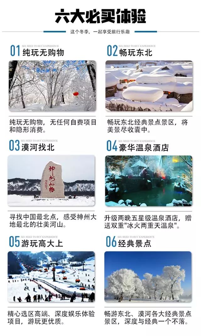 4. 【全程门票费】(雾凇岛门票、万科滑雪场滑雪(含雪杖/雪板/雪鞋/魔毯/雪圈,1次A索道观光缆车)老里克湖门票、长白山往返环保车、雪乡门票+环保车、白桦林门票、龙江第一湾门票、北极村门票、观音山门票)