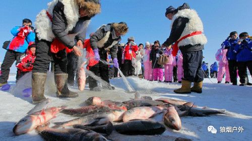 13:00 到达了镜泊湖附近,大家快快找个地方补充点能量,下午才有热情好好的参观冬捕活动。首先在冰面上下网,由经验丰富的鱼把头根据冰面的颜色,选定地点后在冰面打好冰眼,把网纲在冰下穿过,然后逐渐围拢,最后在出网口把冰下的渔网拉到冰面上。最为激动人心的时刻那就是起网啦,在渔夫们高亢的号子声中,拉网的马轮子开始绞动,800多米长的大网从冰洞中渐渐滑出,顿时,伴随着水气汹涌而出的活蹦乱跳的胖头鱼、鲫鱼、鲤鱼等等,在冰面上翻滚着、跳跃着。只见大家赶紧上前去大饱眼福,都来沾点“连年有余”的福气。