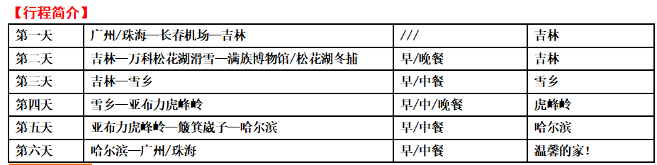 参考航班:珠海起止·长春进哈尔滨出6天【逢周一、周四】珠海飞长春: CZ8530/15:00- 20:50经停盐城;哈尔滨飞珠海:CZ3666/16:20- 22:55经停合肥 【逢周三、周日】珠海-长春:CZ8530/15:00- 20:50经停盐城;哈尔滨-珠海: CZ8202/16:25- 23:30经停临汾