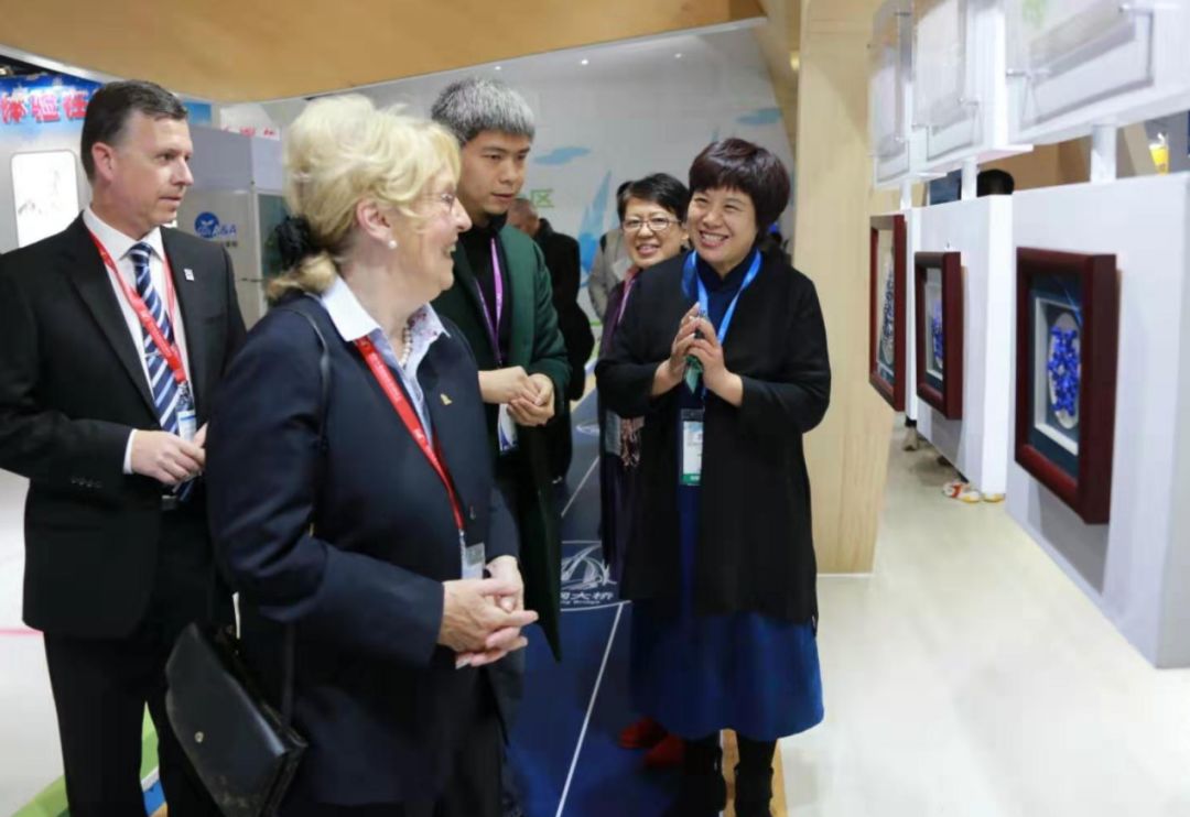 ↑↑国际冰壶联合会(WCF)主席凯特女士(Kate Caithness)参观我区展台非遗文化雪花盘扣、雪花剪纸