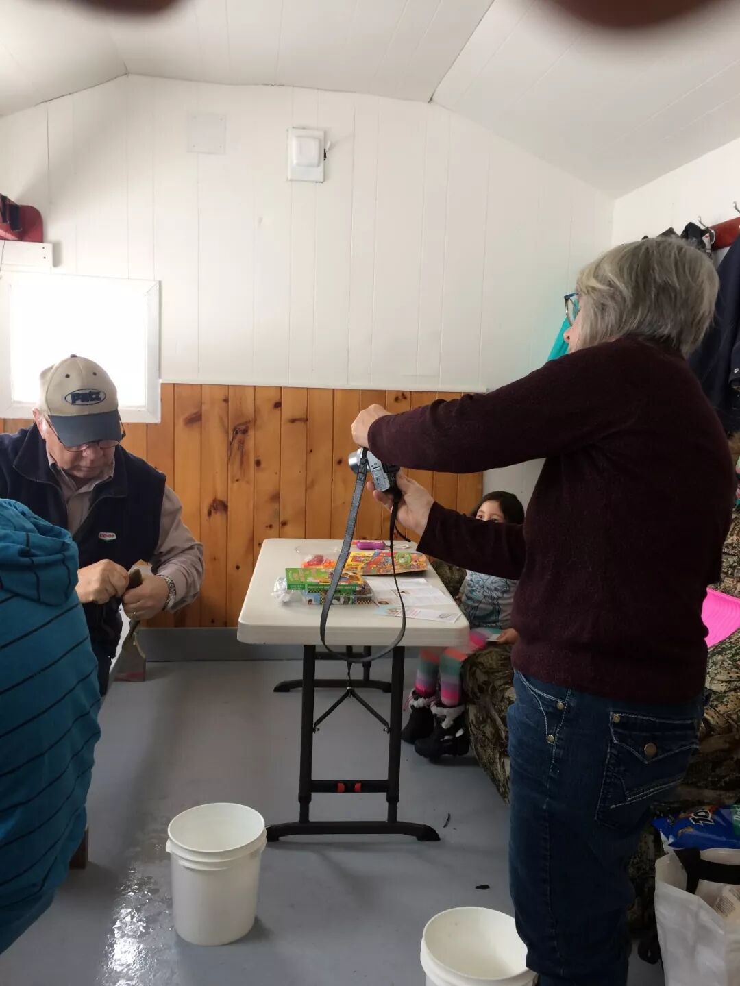 开始搞,这里冰钓的方法是拿猪肝作为鱼饵,用鱼钩勾住猪肝,然后将带有猪肝的鱼线慢慢放入冰洞中,等待鱼儿上钩。鱼线上绑着一个小火柴棍儿,当有鱼触碰鱼饵时,火柴棍儿会有抖动,这时便可以果断提起鱼线,所以火柴棍起到鱼漂的作用。
