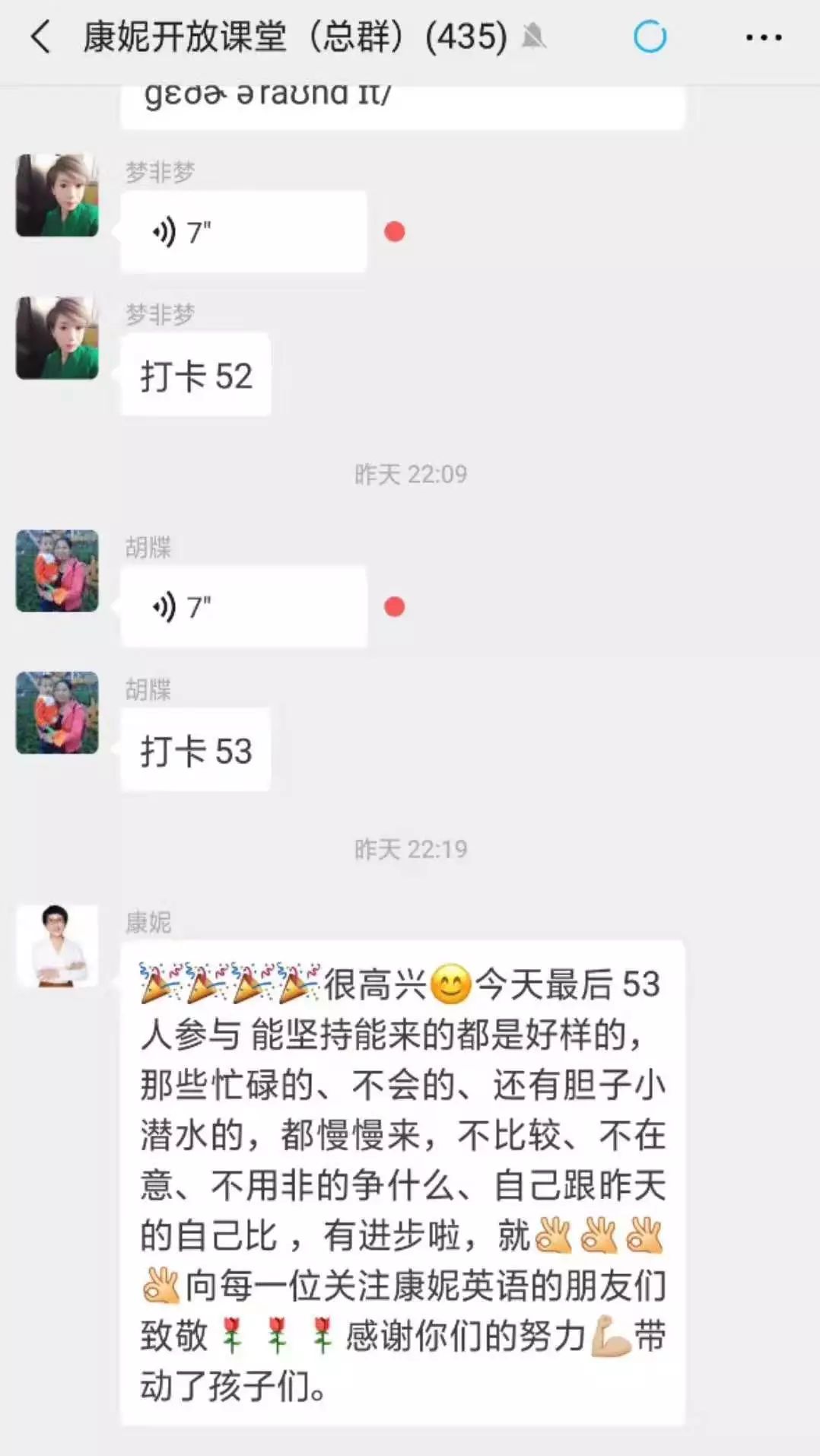 目前已经持续45天啦!发现了一些宝藏妈妈,本身英语基础就很好,口语发音标准,热心为他人服务,本周招募首批妈妈纠音班班,服务他人的同时,对自己也是一种成长。