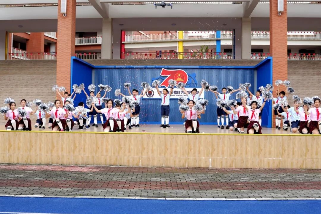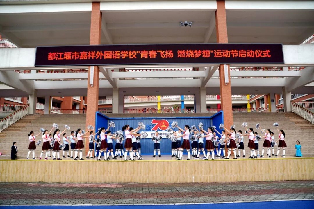 优雅的舞曲还未从台上消散,热烈的啦啦操队员已经迫不及待的抢占了舞台,看,他们的笑容如同十月最灿烂的阳光,他们的自信的目光洒满了整个操场,整齐划一的动作,灵动活泼的步伐配着青春洋溢的旋律,展现出嘉都少年积极向上的模样,绚丽的礼花更是将节目气氛推向高潮。