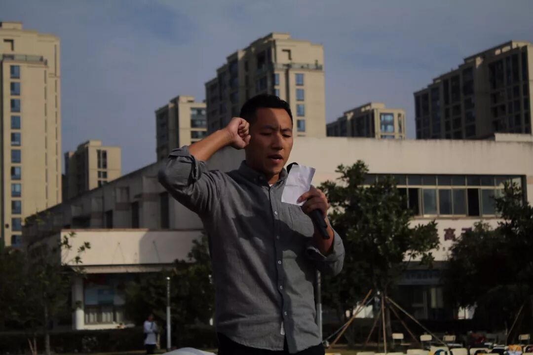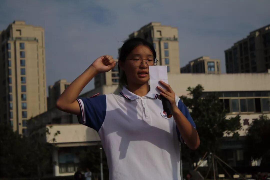 国旗随着一道道敬畏的目光慢且坚定地升起,为水洗般的碧色蓝天装点上一抹色彩。李校长致开幕词