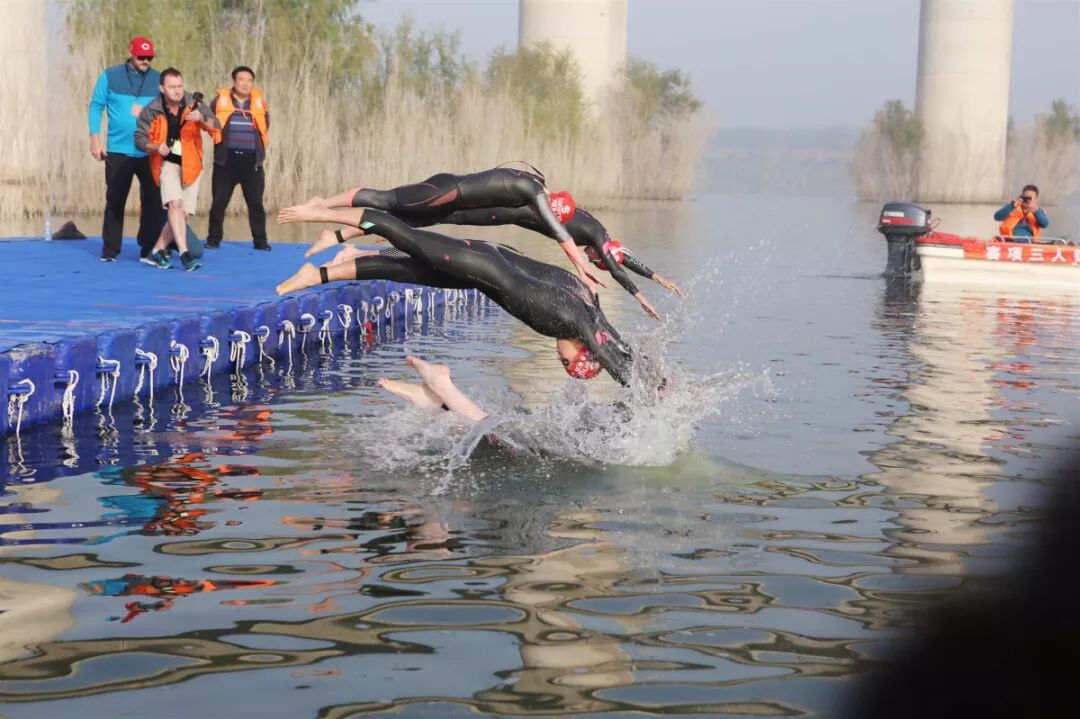 在比赛中,运动员必须按照游泳赛段、游泳至自行车换项、自行车赛段、自行车至跑步换项、跑步赛段的顺序完成比赛,直至到达终点。游泳赛段设在园博湖,选手们上演了“铁人激水,百鸟齐飞”。清晨的湖水虽然微有凉意,但是运动员们却依旧勇往直前。
