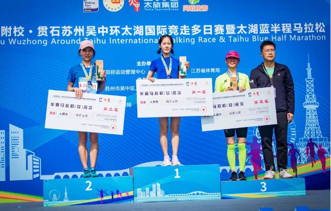 中国选手倪志艳、陈娜、徐晓玲分别以1小时34分14秒、1小时34分54秒、1小时40分17秒的成绩夺得女子太湖蓝21.0975公里挑战赛第一名、第二名和第三名。