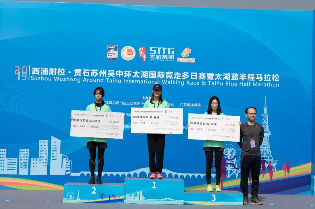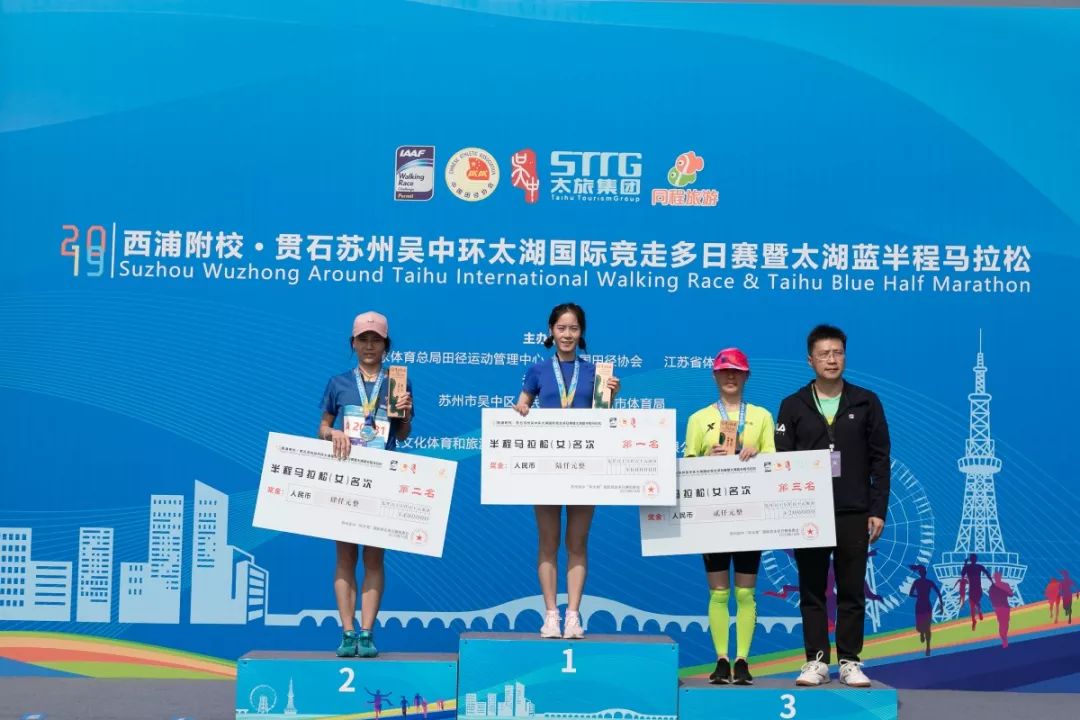 中国选手倪志艳、陈娜、徐晓玲分别以1小时34分14秒、1小时34分54秒、1小时40分17秒的成绩夺得女子太湖蓝21.0975公里挑战赛第一名、第二名和第三名。