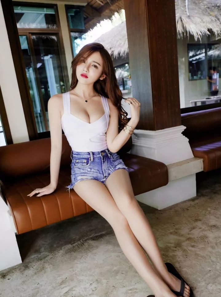 美女一件白色的紧身吊带搭配上牛仔短裤,看起来清爽干净,一双长腿超吸睛。