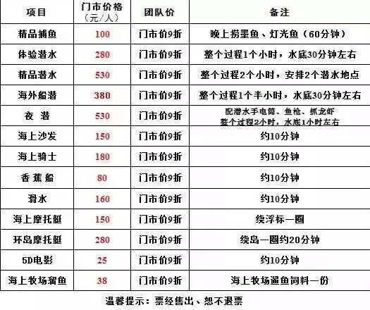 注:报名费内都不包含海上娱乐项目, 个人自由选择,以下为参考价格;