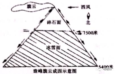 安徽省池州市2017届高三4月联考 “旗云”为珠穆朗玛峰上的一种奇观,因出现时其形如旗,被称为“旗云”。云沿着山顶飘向一边,仿佛一面迎风招展的旗帜。珠穆朗玛峰7500米以下被冰雪覆盖,7500米以上由于高空风大,山坡陡峭,降雪不易堆积,多为碎石坡面。读“旗云”示意图,完成1-3题。