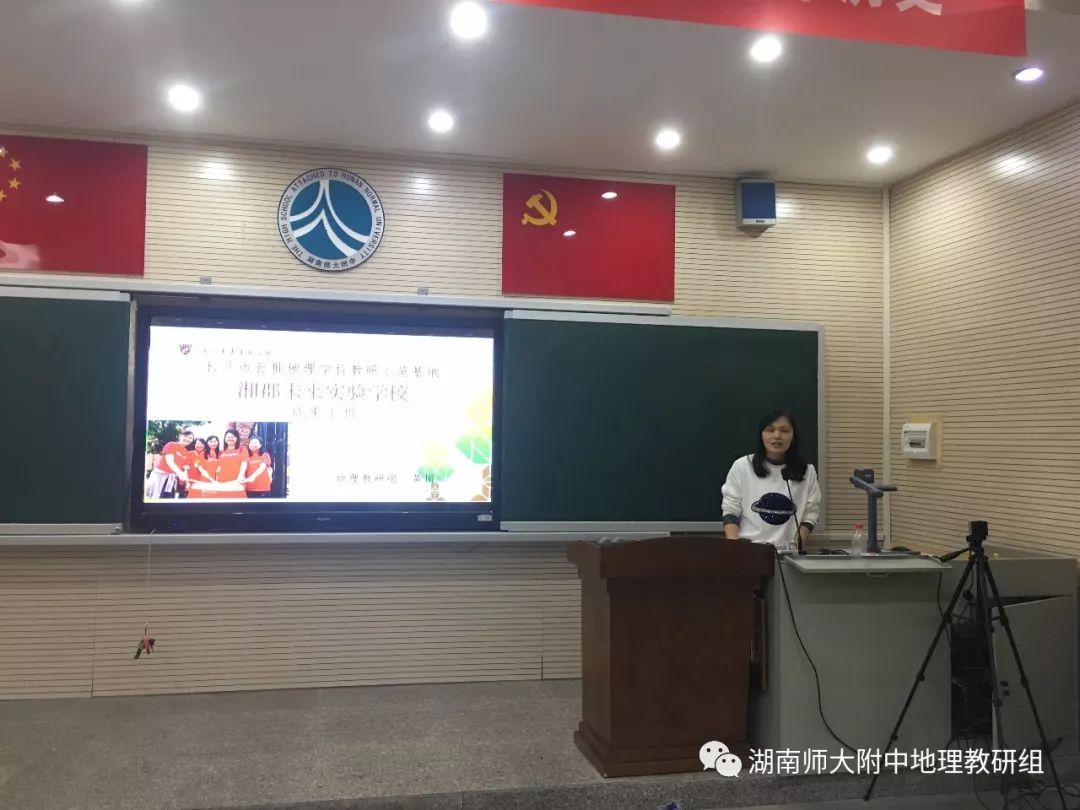 接着举行了长沙市首批地理教研示范基地成果汇报会。湖南师大附中、长郡双语中学、湘郡未来实验学校、青竹湖湘一外国语学校四所长沙市首批地理基地校依次汇报了近3年来地理教研的成果。四所学校分别从课程和教学改革创新、青年教师培养、特色活动等方面介绍了本校地理教研的各类成果。湖南师大附中地理科学野外考察等实践课程开发和拔尖创新学生培养成绩显著,长郡双语的翻转课堂和研学课程特色突出,湘郡未来实验学校行走课堂实践成果丰富,青竹湖湘一外国语学校走读湘江研学旅行课程社会影响深远。
