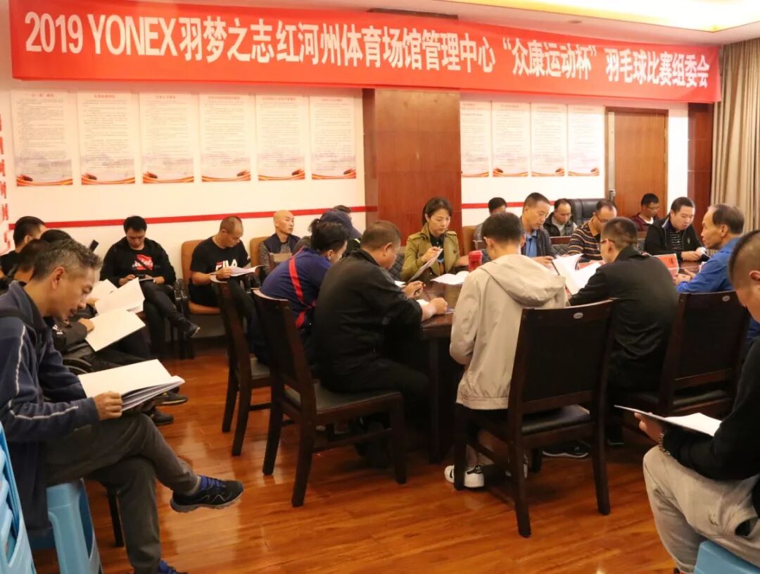 10月18日下午,2019YONEX羽梦之志红河州体育场馆管理中心“众康运动杯”羽毛球混合小团体赛组委会在红河体育馆召开,红河州教育体育局群众体育科主任科员刘鹏,红河州体育总会秘书长龙英,红河州体育场馆管理中心负责人、本次比赛组委会主任毛伟,红河州羽毛球协会会长廖凤华,云南众康商贸有限公司总经理杨红平,YONEX西南区业务经理代瑶,本次比赛裁判长印解初,及各参赛队领队等参加会议。