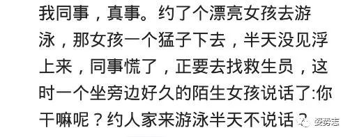 同事约一漂亮女孩游泳,扎水下了人没了,半天没上来同事准备求救,结果旁边一大妈说把人家约出来也不说话。
