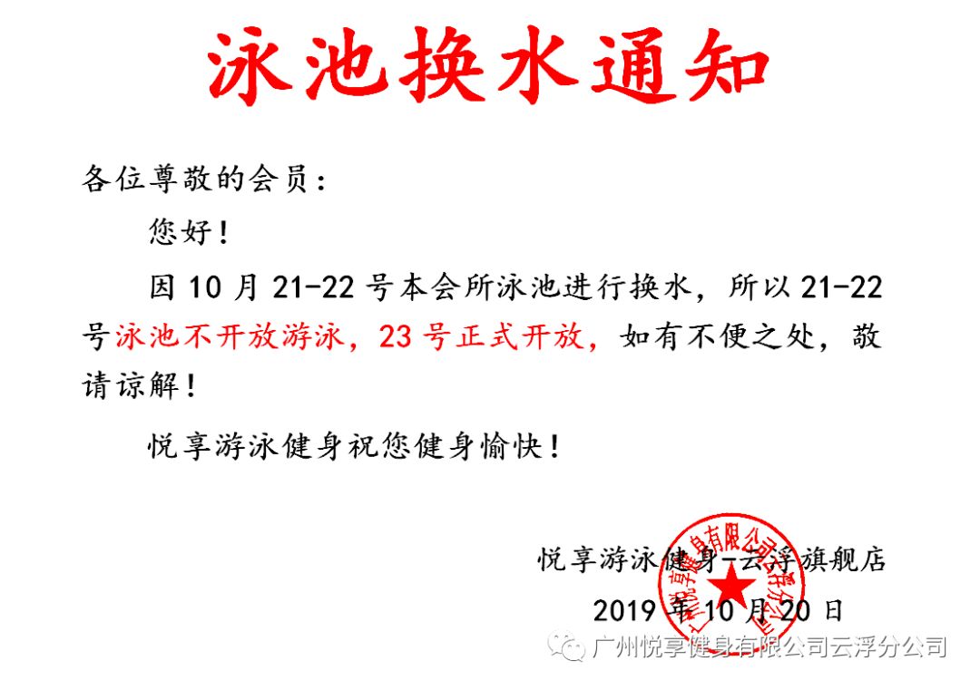 悦享游泳健身俱乐部2019年10月21-22号换水通知