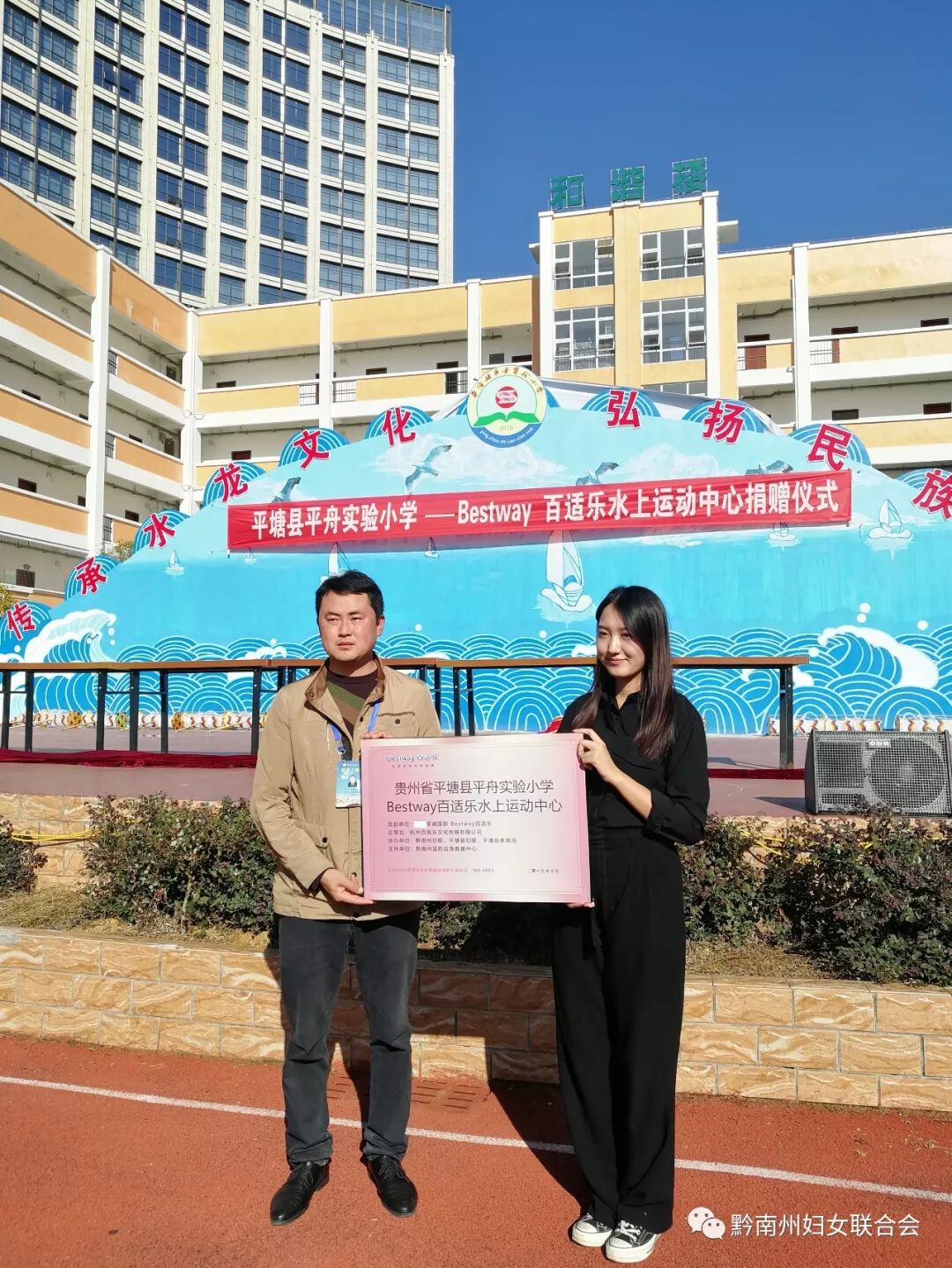 10月18日下午,“Bestway百适乐水上运动中心捐赠仪式”在黔南州平塘县平舟实验小学举行。黔南州妇联四级调研员金英,县教育局副局长邓剑,县妇联干部刘义薇及Bestway百适乐品牌代表:杭州百视乐文化传媒总经理杜军、黔南州蓝豹应急救援中心、平舟实验小学师生近一千余人出席此次活动。活动中孩子们表现出了积极踊跃的态度,看着孩子们开心的笑容,州妇联也希望能多多促成类似的公益活动,同时平舟实验小学的副校长令狐昌和也向前来参加活动的各位领导和捐赠企业表达了感谢,活动结束后平舟实验小学令狐昌和副校长和Bestway百适乐品牌代表:杭州百视乐文化传媒营销总监王艳迪代表公司进行了授牌仪式。