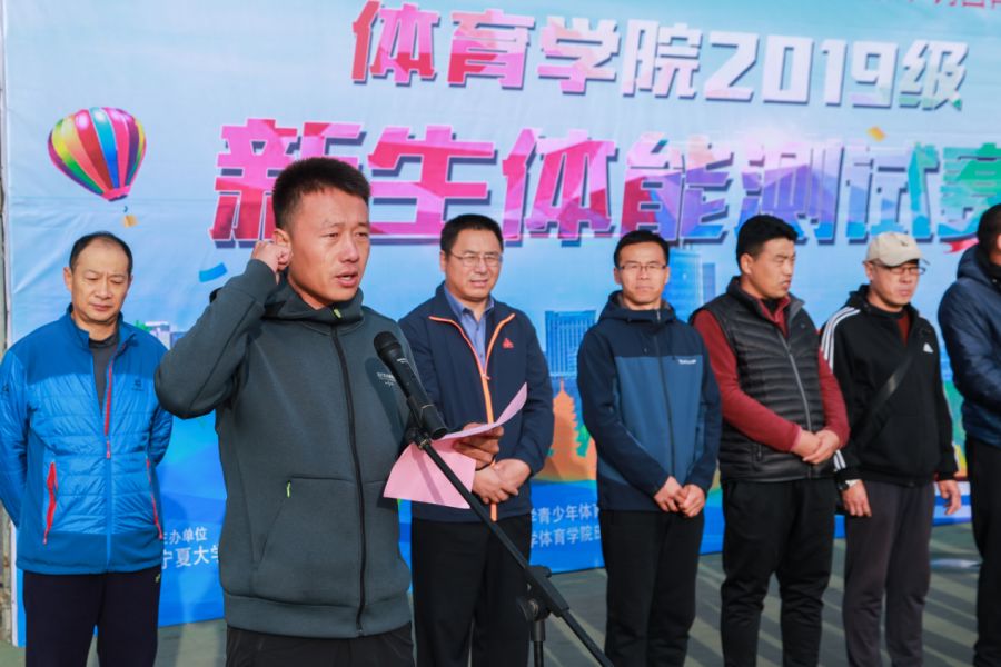 为了深入贯彻全国教育大会、全国高等学校本科教育工作会议精神,10月19日上午8:30,以“不忘初心 牢记使命 为党育人 为国育才”为主题的体育学院2019级新生体能测试赛在宁夏大学怀远校区田径场举行。出席此次开幕式的有宁夏大学体育学院行政领导班子,银川市十五所中小学体育教研室主任,体育学院田径教研室部分老师以及体育学院2019级全体新生,开幕式由宁夏大学体育学院副院长赵奋军主持。