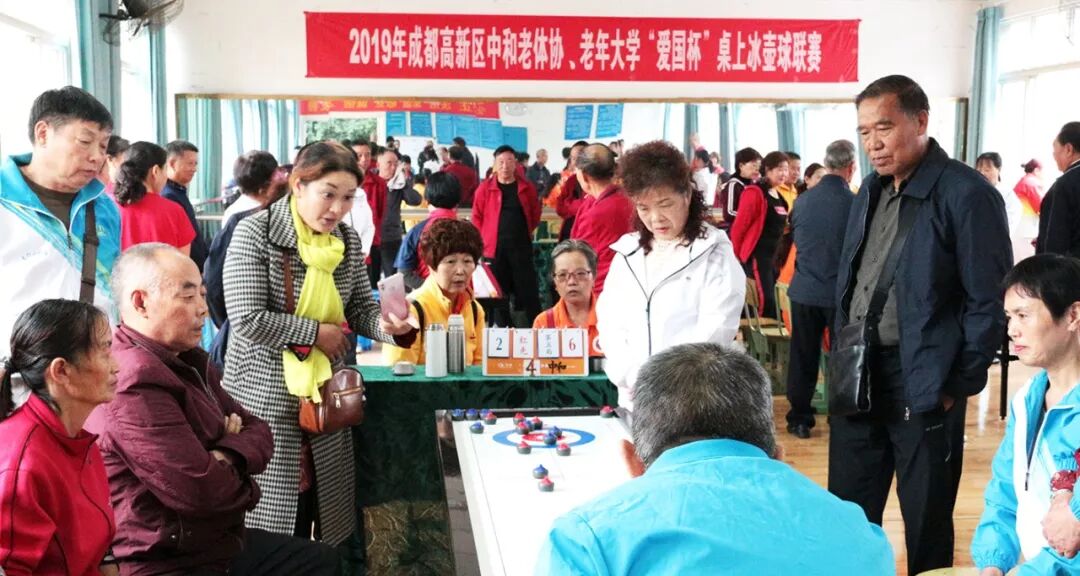10月20日,2019年成都高新区中和街道老体协老年大学“爱国杯”桌上冰壶球联赛在中和街道老年大学举行,来自中和街道老年大学和中和街道各社区老体协的16支代表队110余名运动员、教练员和领队参加比赛。成都高新区老体协梁义花同志到场指导。中和街道老体协主席李诗百、副主席夏玉书、秘书长王世楷,中和街道老年大学副校长邓正富、体育处主任林昌良出席开幕式。