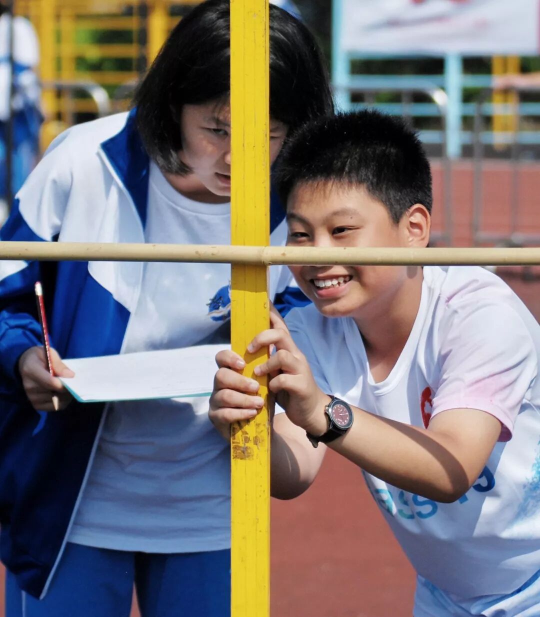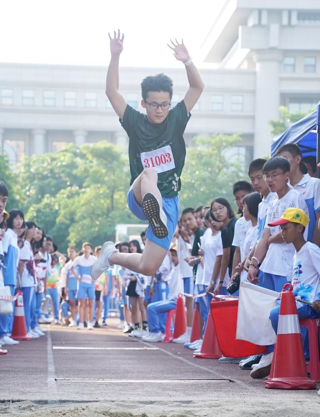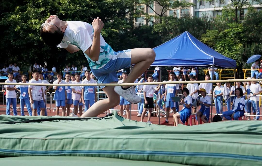 而在炎炎烈日下,一跃而起,划越半空,不断吸引着大家目光焦点的是跳高项目。只见运动员们目光炯炯,神采飞扬,他们矫健的身姿随着哨声响起的刹那,似乎全身所有的运动神经都被调动起来了,急速地助跑后他们倾尽身体重心,于霞蔚天际中划出一道美丽的弧线,轻盈起落处唤起一阵阵喝彩声。