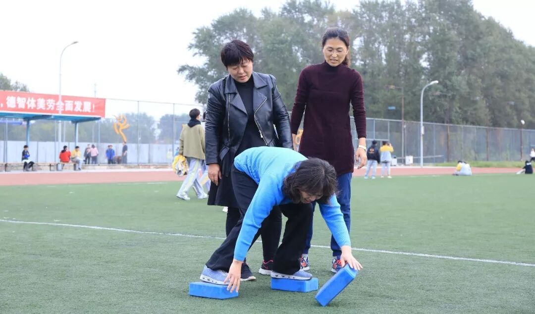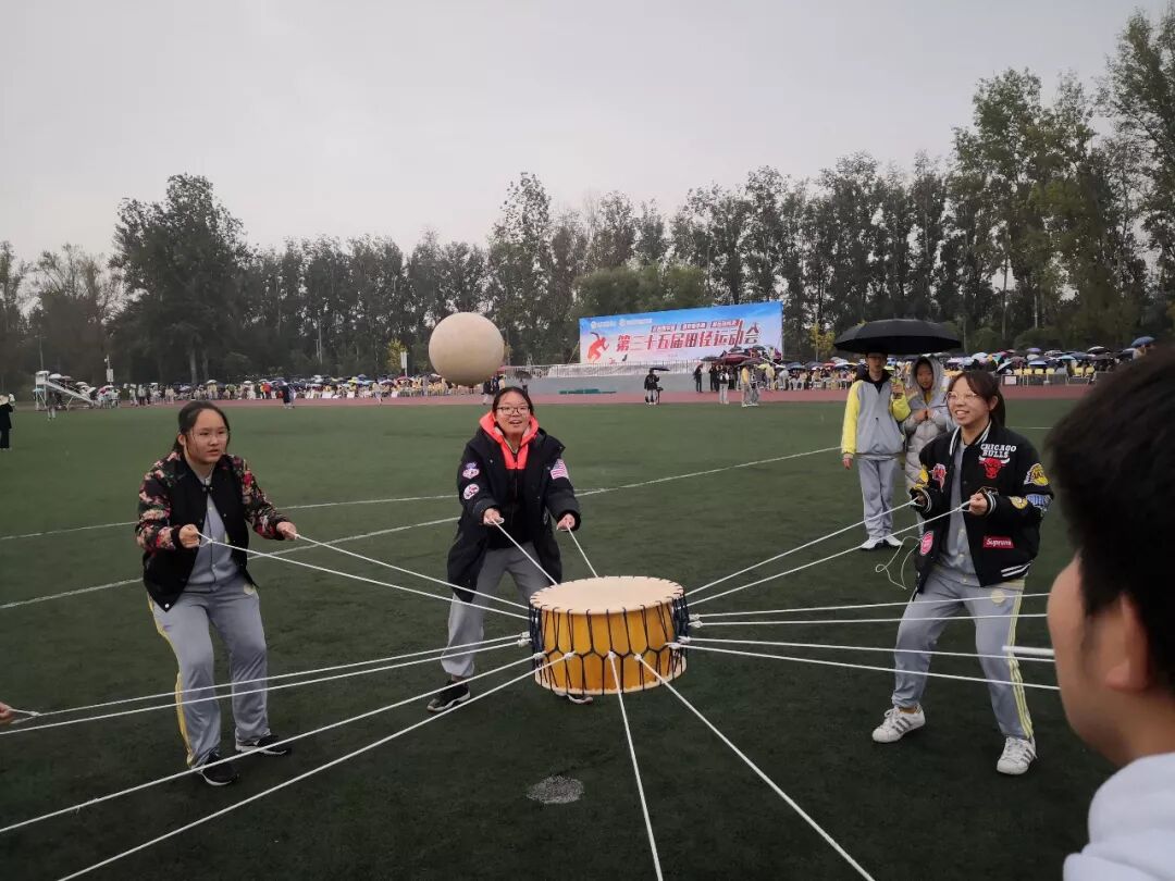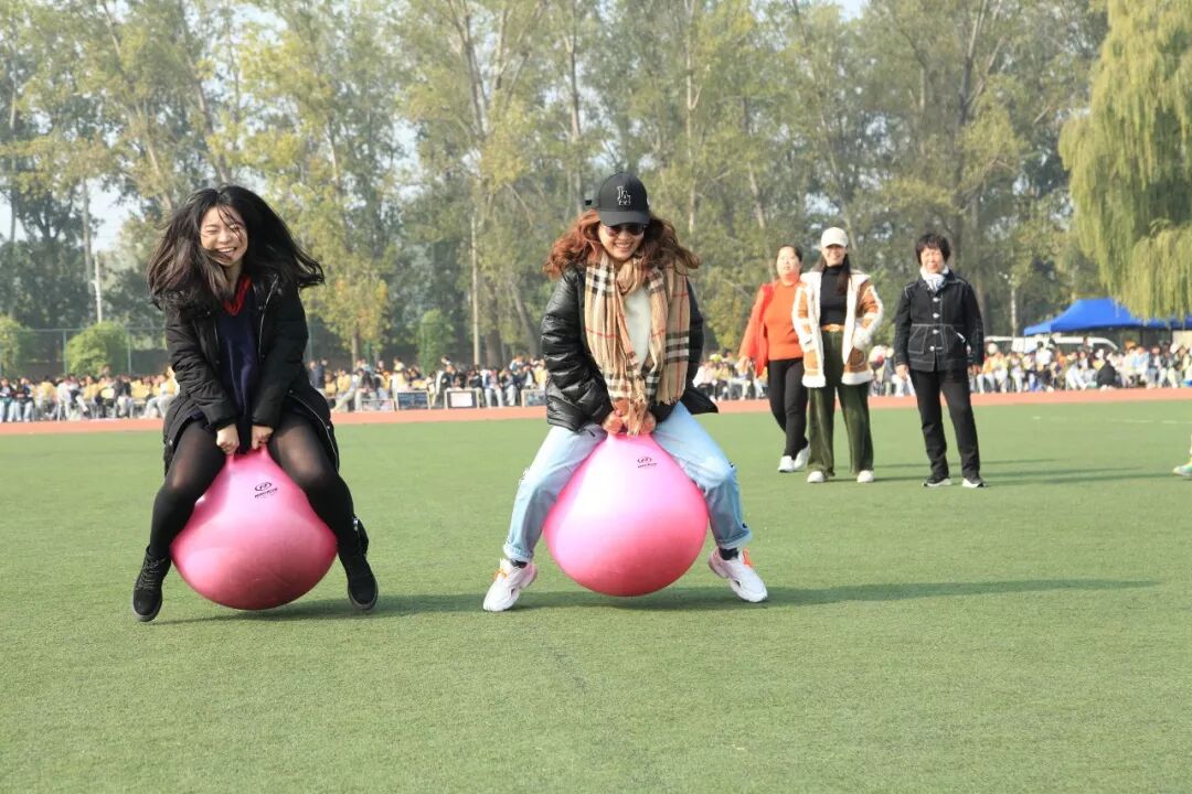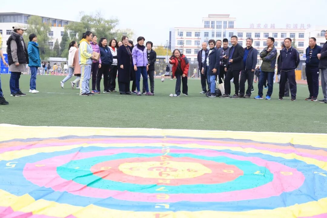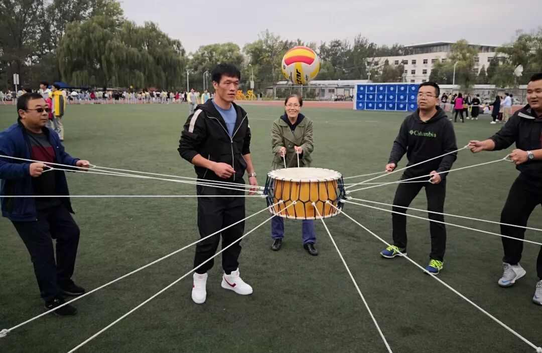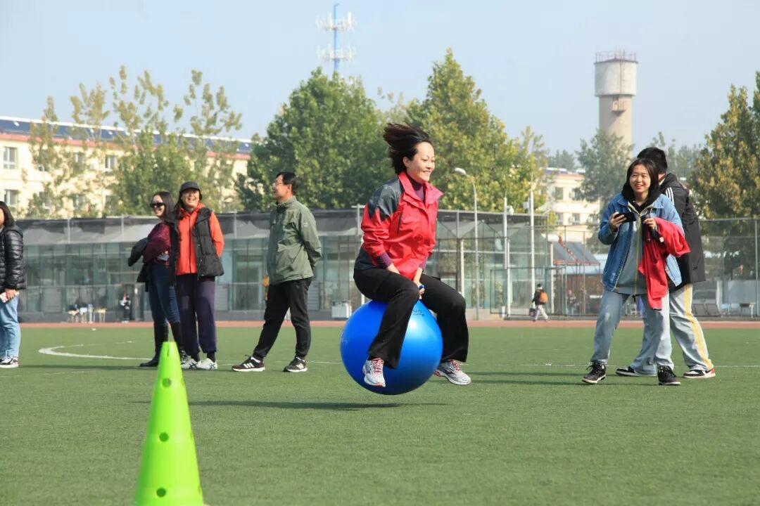 老师们此时也活跃了起来,他们随机组队参加击鼓颠球的传统项目。老师们神情专注,努力通过彼此协作用一面大鼓接住每一次的落球。而同学们也在旁边兴致勃勃地围观,赞叹老师们迅速掌握的技能和团队合作的能力。由于教工年龄差异较大,运动会为教工们设计了丰富多彩的趣味项目,如足球射门、摸石过河、跳跳球接力等。50岁以上的老年职工还可以参加更为安全、体力消耗低的项目,如夹玻璃球、沙包投准、定点投篮等等。老师们积极地参与到各个项目当中,感受运动的快乐。