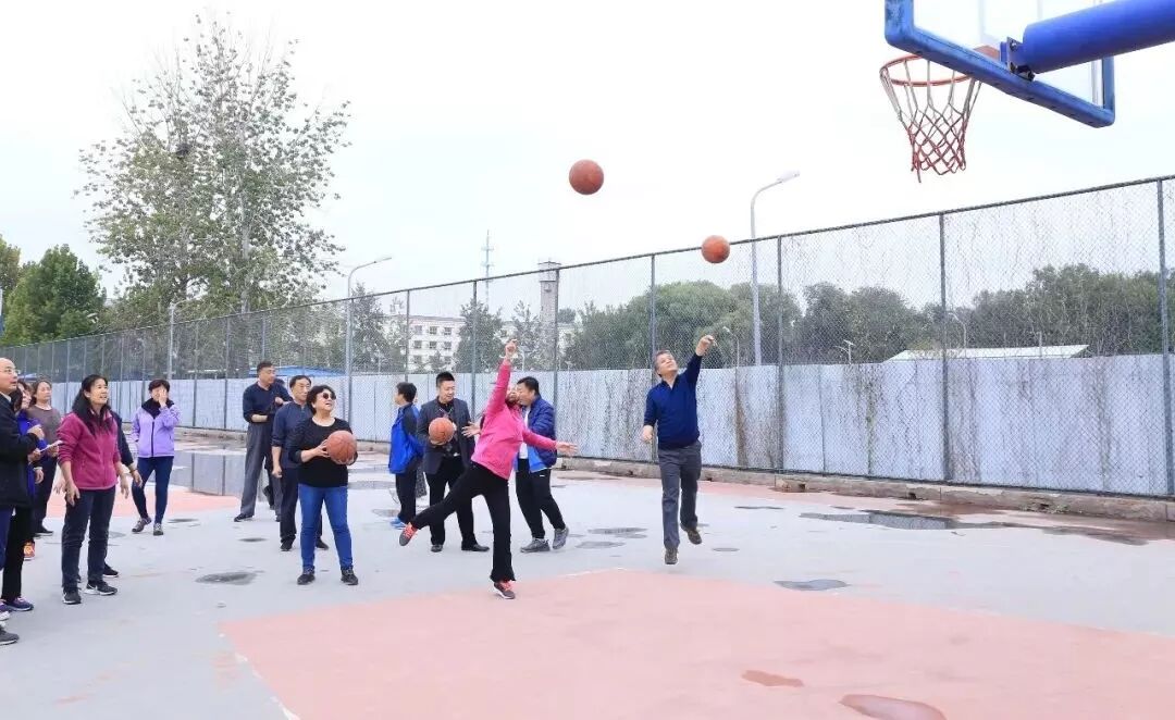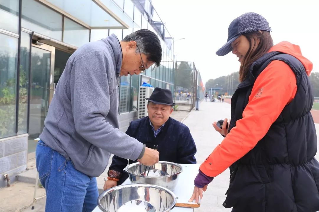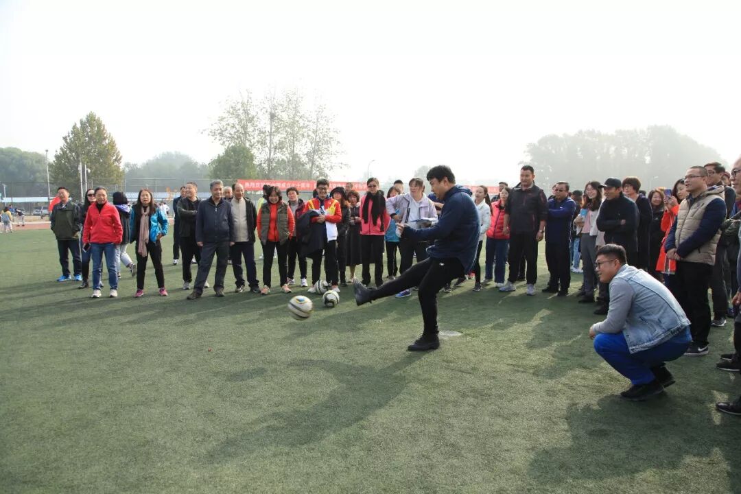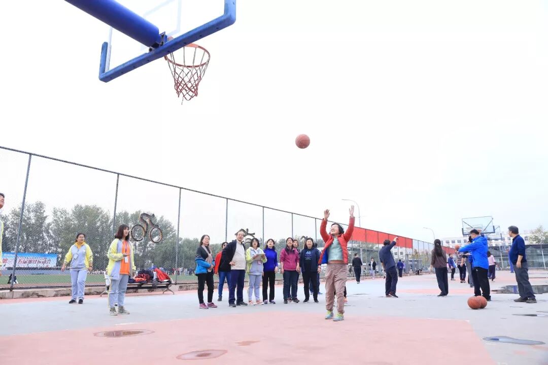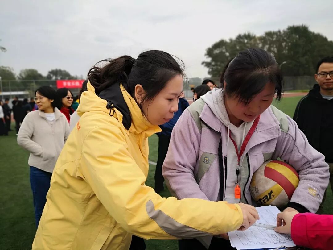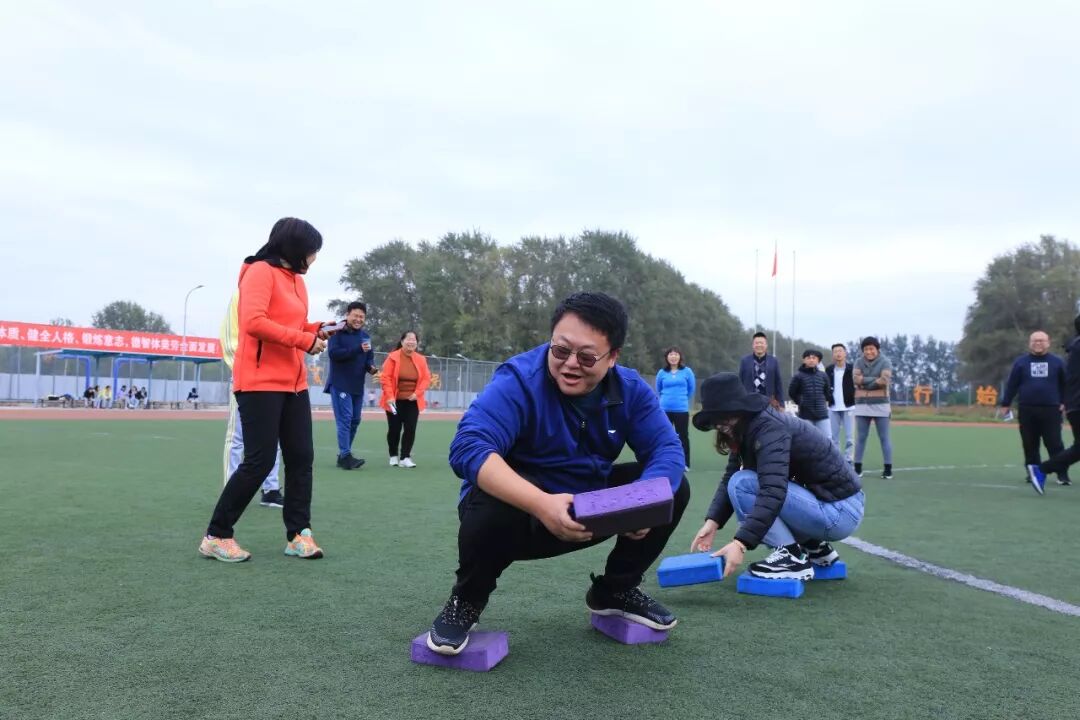 老师们此时也活跃了起来,他们随机组队参加击鼓颠球的传统项目。老师们神情专注,努力通过彼此协作用一面大鼓接住每一次的落球。而同学们也在旁边兴致勃勃地围观,赞叹老师们迅速掌握的技能和团队合作的能力。由于教工年龄差异较大,运动会为教工们设计了丰富多彩的趣味项目,如足球射门、摸石过河、跳跳球接力等。50岁以上的老年职工还可以参加更为安全、体力消耗低的项目,如夹玻璃球、沙包投准、定点投篮等等。老师们积极地参与到各个项目当中,感受运动的快乐。