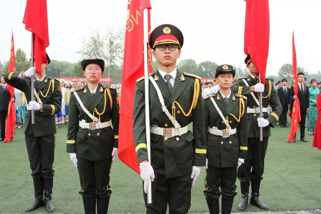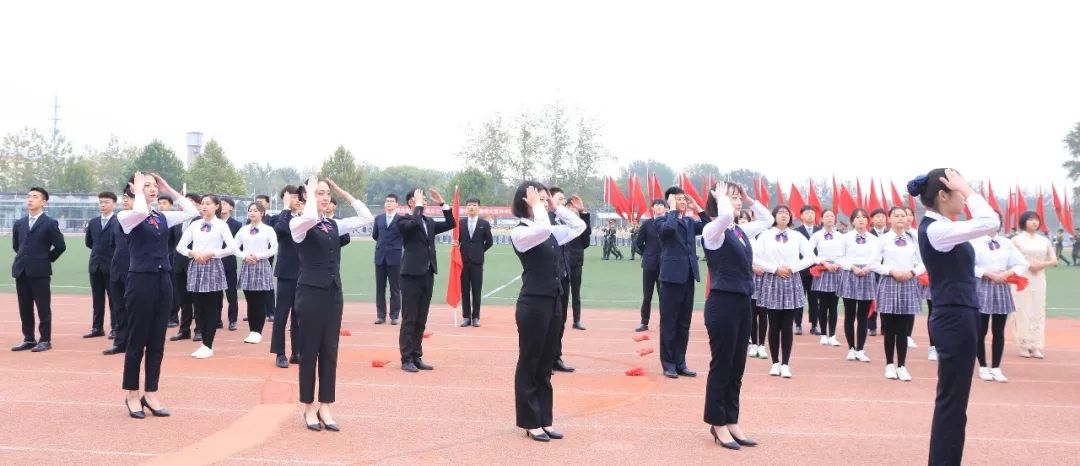 数千名师生齐聚运动场,首先进行的是精彩纷呈的运动会开幕式,每一个方阵都凝聚着各个系部的汗水和智慧。国旗班的亮相英姿飒爽,标准的军姿、鲜红的国旗诉说着学子的爱国之心。各系部方队或身着工服,展示职业人的专业精神;或身着民族华服,用舞蹈用歌声赞美祖国、挥洒美丽青春。整齐而绚烂多姿的方队唤起在座的老师和同学们阵阵热烈掌声。各队列齐后,全场起立奏唱国歌,数千名师生面向国旗庄严注目,重温庆祝中华人民共和国成立70周年盛景。