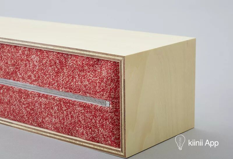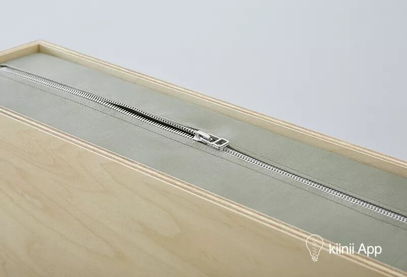 从夹克上剪下适合的大小,缝制上拉链,与合板黏合后,最后刷上保护层。