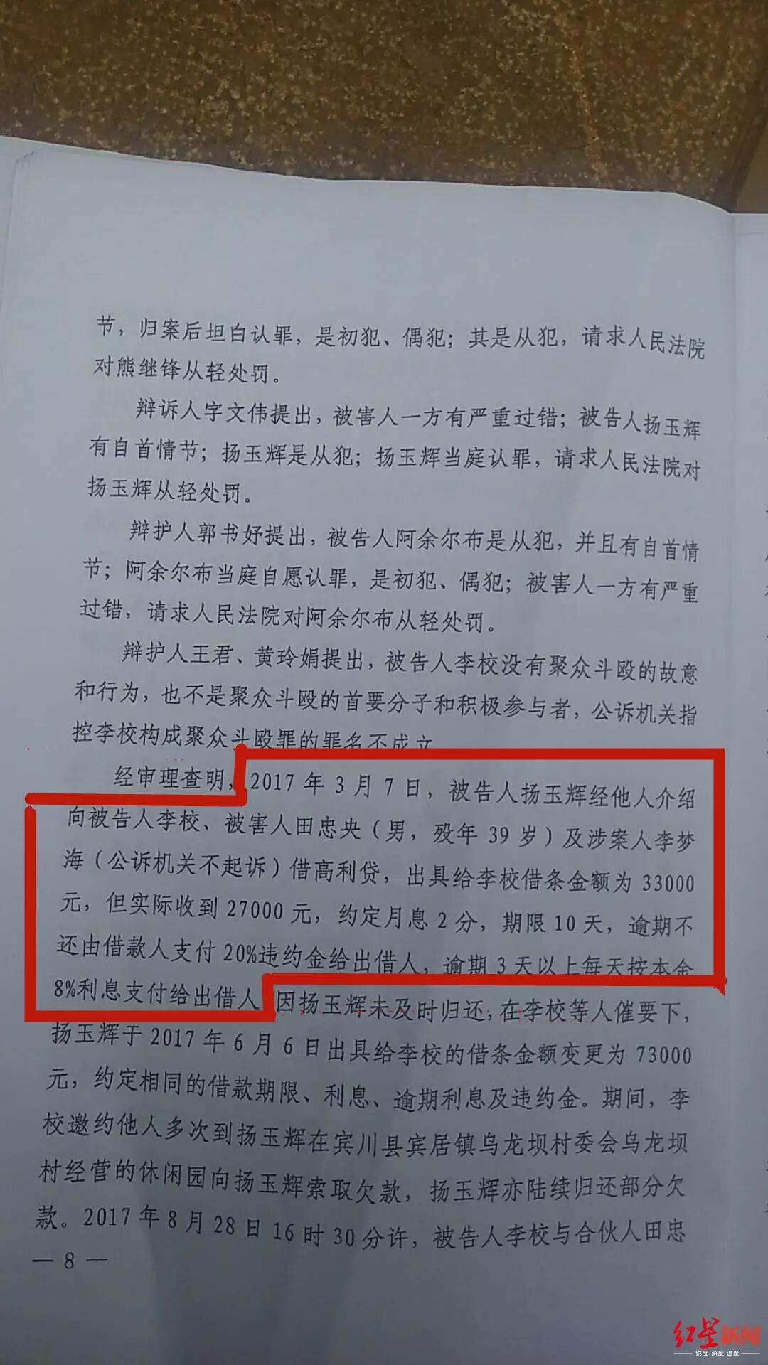 大理州中级人民法院所作的《刑事附带民事判决书》,就这一事实表述如下:2017年3月7日,杨玉辉经他人介绍,向江西余干人李校、李梦海、田忠央借高利贷,出具给李校借条金额为33000元,但实际收到27000元,约定月息2分,期限10天,逾期不还由借款人支付20%的违约金给出借人,逾期3天以上每天按本金8%利息支付给出借人。