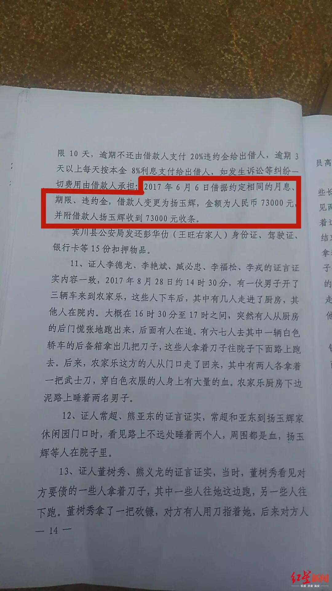 判决书载明,因杨玉辉无法及时归还本金和利息,在李校等人催要下,杨玉辉于2017年6月6日出具给李校的借条金额变更为73000元,约定相同的借款期限、利息、逾期利息及违约金。期间,李校多次邀约他人到休闲园向杨玉辉索取现款,杨玉辉亦陆续归还了部分欠款。熊芬燕称,他们前后共计给了1万元左右的利息。