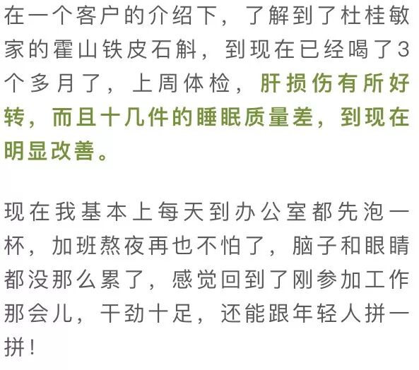 我是做销售的,由于工作太忙,而且我每天应酬又多,肠胃越来越差,什么都吃不进去,咽喉也总是肿痛,后来我爸妈买霍山铁皮石斛泡水给我喝,没想到喝了一段时间后,我的肠胃渐渐好了,吃饭也香了,脸上多年的斑点也没有了!平时也感觉干劲十足。人到中年体质不应该走下坡路,感觉自己还能在岗位上和年轻人一起拼!——2019-9-30