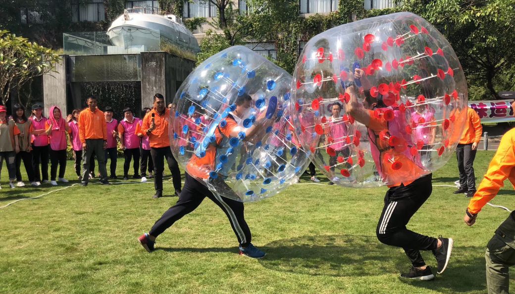 队员穿着直径1米的充气球,在指定区域将对方撞出为胜。