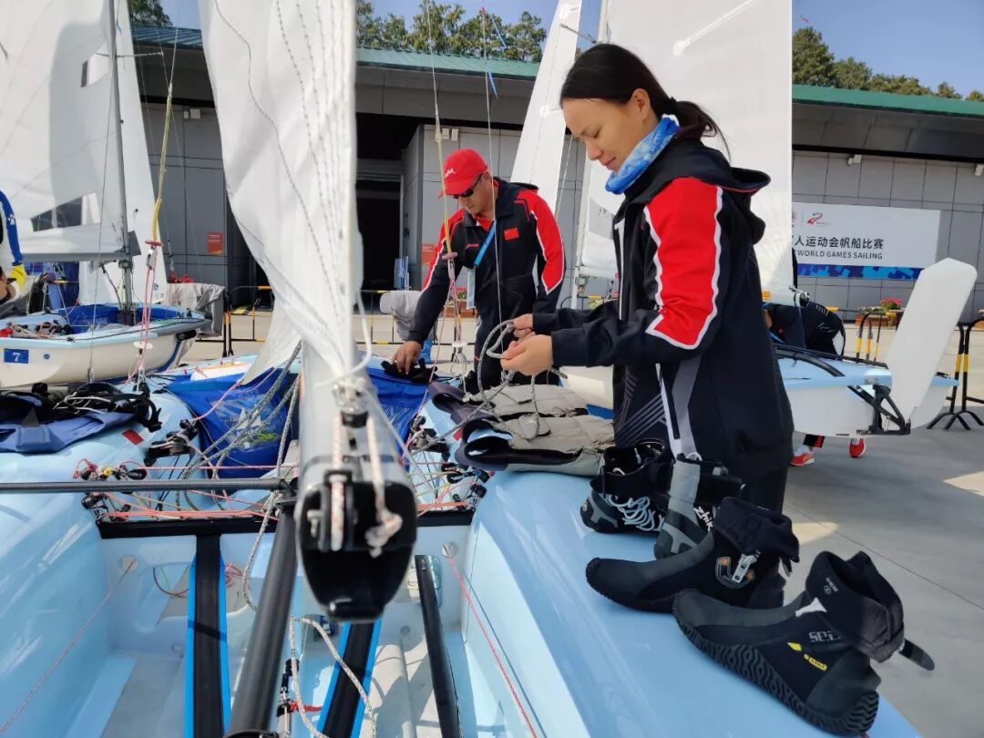 中国八一队帆船队员在做赛前准备(记者国泰盛拍摄)